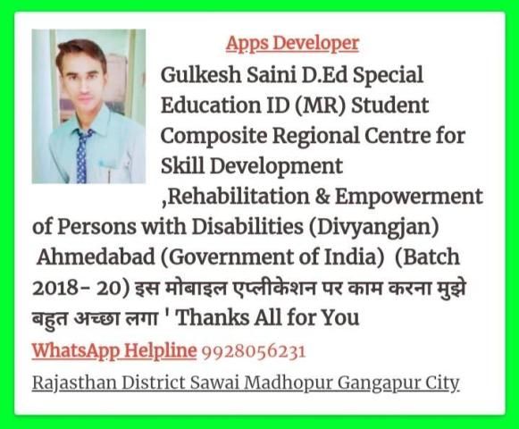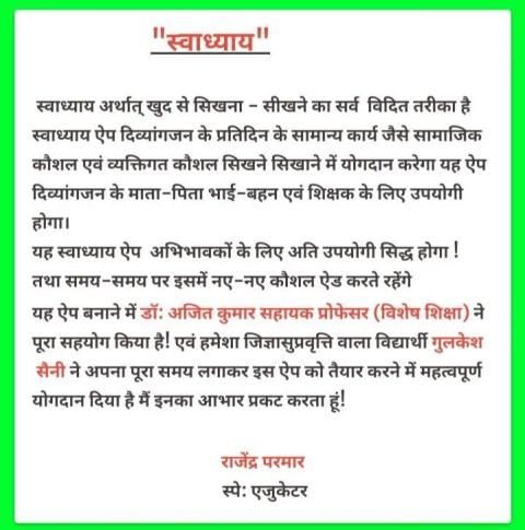 स्वाध्याय अर्थात् खुद से सिखना - सीखने का सर्व विदित तरीका है स्वाध्याय ऐप दिव्यांगजन के प्रतिदिन के सामान्य कार्य जैसे सामाजिक कौशल एवं व्यक्तिगत कौशल सिखने सिखाने में योगदान करेगा यह ऐप दिव्यांगजन के माता-पिता भाई-बहन एवं शिक्षक के लिए उपयोगी होगा