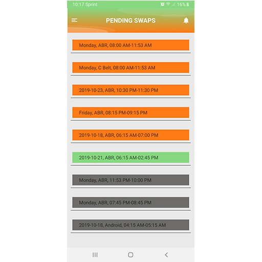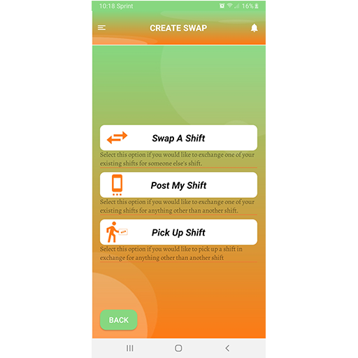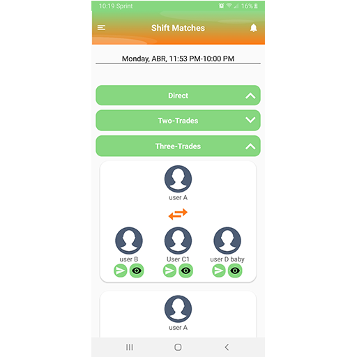 This app is designed to connect users with other users that desire to exchange shifts. A user may choose to swap, give away,