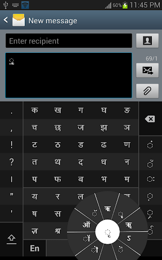 In Devanagari, we frequently need to type a combination of a consonant (ध) and a matra (ो) like ध ो = धो. When you touch a consonant, a chakra with combination of consonants and 10 frequent matras pops up (धा, धि, धी, धु, धू, धे, धै, धो...). The chakra gives a preview of the possible character combinations. To select a combination, you slide the stylus or finger towards it.
