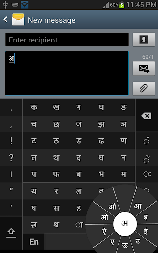 Complete vowels (अ, आ, इ, ई, उ, ऊ, ए, ऐ, ओ, औ) appear in a separate chakra on the bottom right. The less used vowels and matras are next to it (ऽ, ऑ, ृ, ऋ, ॄ, ॠ, ॆ, ॊ, ॅ, ॉ). Numerals, symbols and rarely used characters appear on a shift. You could also switch to the QWERTY keypad temporarily to input English characters.