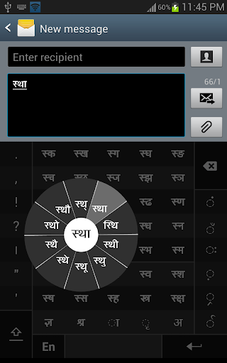 Typing conjuncts like क्रि, स्थ, च्य is particularly hard for most people. Swarachakra makes it easy. First tap on the first part of the combination and select the halant from the chakra (स ्). Swarachakra then shows a preview of all possible conjuncts that begin with that consonant (स ् त = स्त; स ् थ = स्थ etc.). If you need to add a matra, select it from the new chakra like earlier (स्था, स्थि, स्थी, स्थु, स्थू...).