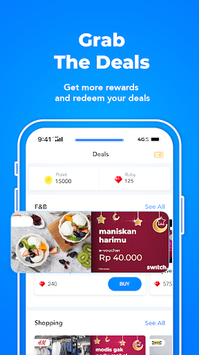 Not a day is wasted, everything is rewarded! You can get food, drink, fashion and e-commerce vouchers from your favorite merchants, or even e-wallet balance if you prefer so. You only need to collect enough points & ruby to get whatever you want on the switch application. Your point can be used to join our flash deal event which offer much more valueable vouchers.