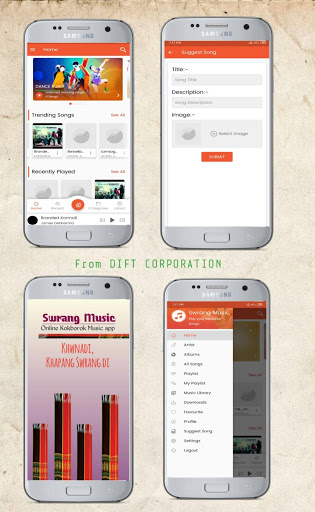 Swrang Music app is an application Personally Sponsored by Mr. G.S Jamatia, General Secretary, DIFT CORPORATION. Fully Maintained, Managed and Developed by DIFT MUSIC DEPARTMENT TEAM Under the Supervision of Mr.Simon Jamatia, President DIFT CORPORATION.