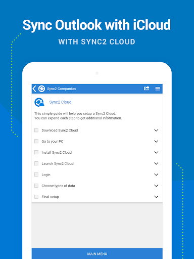 This is a Complimentary Companion that helps you set up synchronization for Outlook with Google, Office 365, Exchange, iCloud and Android, iPhone, iPad sync with iCloud and other cloud services. Sync2 Companion will go through all the necessary settings to set up synchronization.