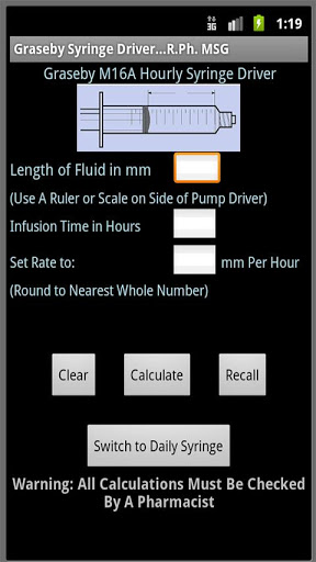 This free app will calculate the rate setting in mm per hour or mm per day for the Graseby Syringe Driver based upon fluid length and infusion time. A time saver for nursing and pharmacy