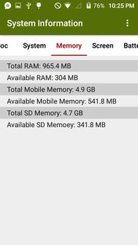 Memory: Total and available RAM, Total and available Internal and external Memory.