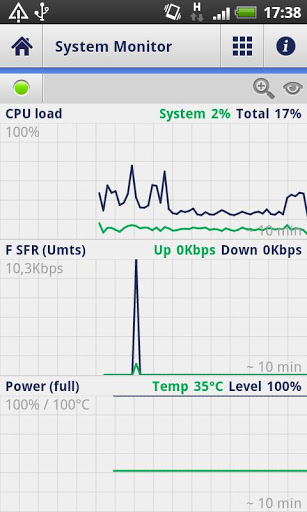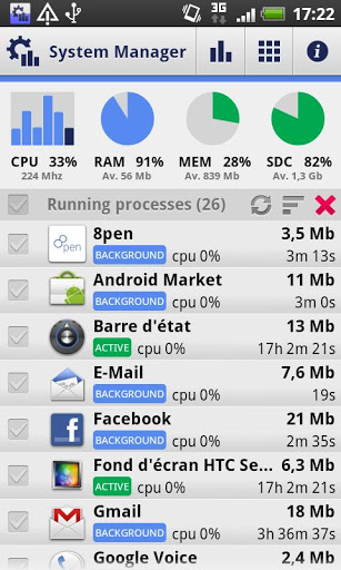 System Manager: Task manager, OS Monitor, Application managerSystem Manager 1.1 Stable Release FREE System Manager is a comprehensive utility for your Android device.For feedback and bug report http:android.adridem.comAny pertinent suggestion will be considered and implemented.Main features: System activity overview: top bar gallery allowing to check the system activity, including live processor usage, RAM and internal memory, external storage, network activity, power level and temperature Task manager: useful feature allowing to view and manage all running programs, processes and services on your device Network and system monitor: advanced feature allowing to troubleshoot your device performance issues by collecting CPU activity, network usage, as well as power level and temperature over time Application manager: feature allowing to relocate or remove applications installed on your device or on external storageSystem Manager is both intended as a live diagnostic tool and as a network processor analyzer. It provides detail information on installed applications, collects system data over time, and offers advanced plotting features to view measurements.