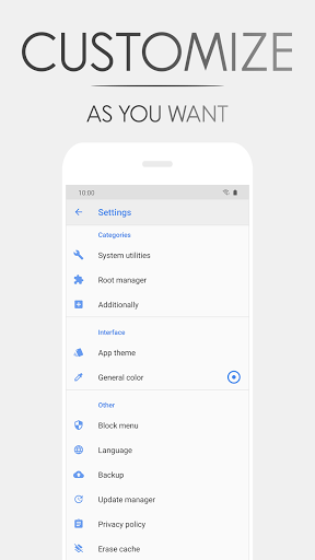 This program includes all the possible utilities that are needed to simplify routine processes and to more flexibly manage the system of your device. List of program features: