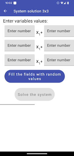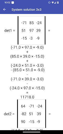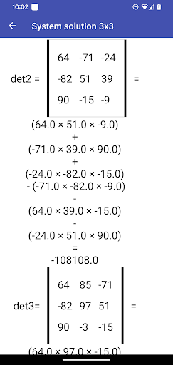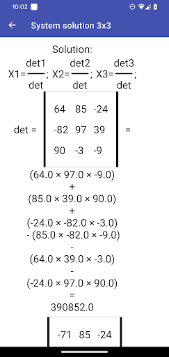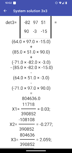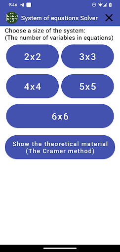 The application allows solving systems of equations of 2-6 order. You will receive a detailed solution of the system of equations with all intermediate calculations.