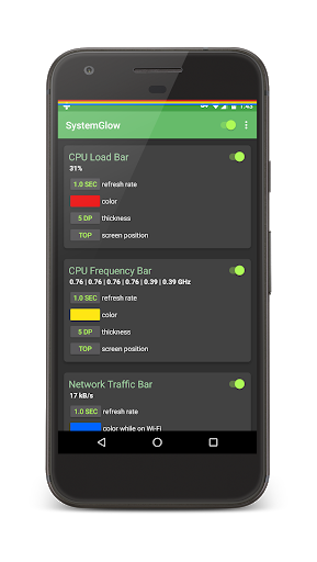 3 configurable bars overlay the top or bottom of the screen and glow in and out of opacity as activity changes.
