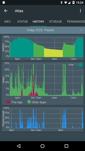 * Show active apps, record app battery, CPU, and wake lock usage over time to show potential battery drain issues
