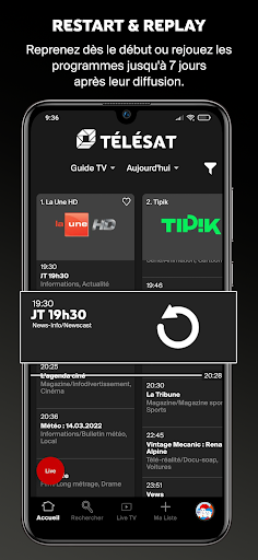 - Regarder du contenu en direct ou en différé jusqu’à 7 jours après diffusion.