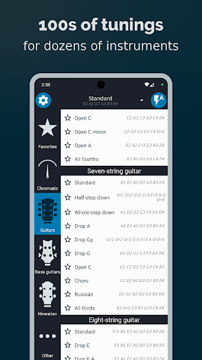✔️ Six-string guitar tuner: Standard, Half-step down, Whole-step down, 1 and 1/2 step down, Two step down, Drop D, Double drop D, Drop C, Drop B, Open D, Open D minor, Modal D, Modal C, Modified Modal C, Modal C6, Open G, Open G minor, Modal G, Open C, Open C minor, Open A, All fourths.