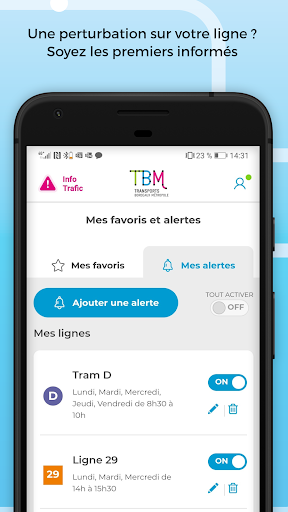 Cree su cuenta de MyTBM de la aplicación móvil o en el sitio web de InfOTBM y simplemente administre sus favoritos, alertas y suscripciones.