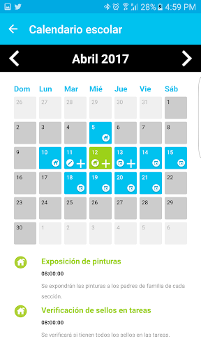 - School calendar showing the events and delivery homework dates that have been generated by teachers.