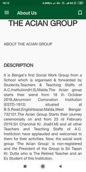 It is Bengal's first Social Work Group from a School which is organised & forwarded by Students,Teachers & Teaching Staffs of A.C.Institution(H.S),Malda.The Acian group starts their wend from 18 th October 2018.Akrurmoni Corronation Institution (ESTD-1912) situated at B.S.Road,Englishbazar,Malda,West Bengal-732101.The Acian Group Starts their journey ceremonially on and from 23 rd February 2019.Sri Chanchal Kr. Jha(H.M) and all other Teachers and Teaching Staffs of A.C. Institution have applauded and welcomed to them for their activities.