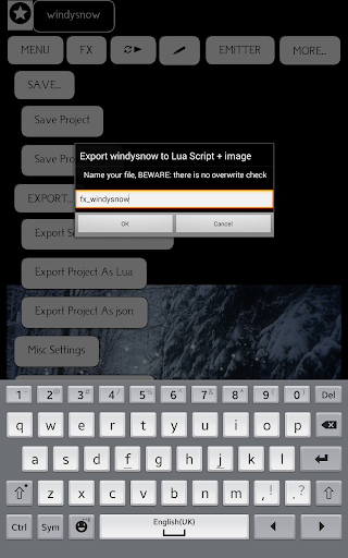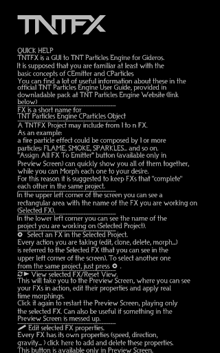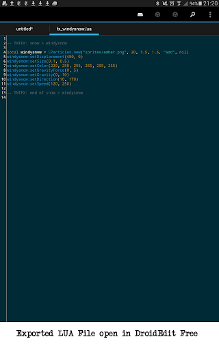 - Export particles as Lua code and images, ready to import into your Gideros Projects.