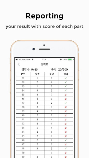 ✓ After completing each test, you can view the results (number of correct answers, points, levels, tables answers ..)