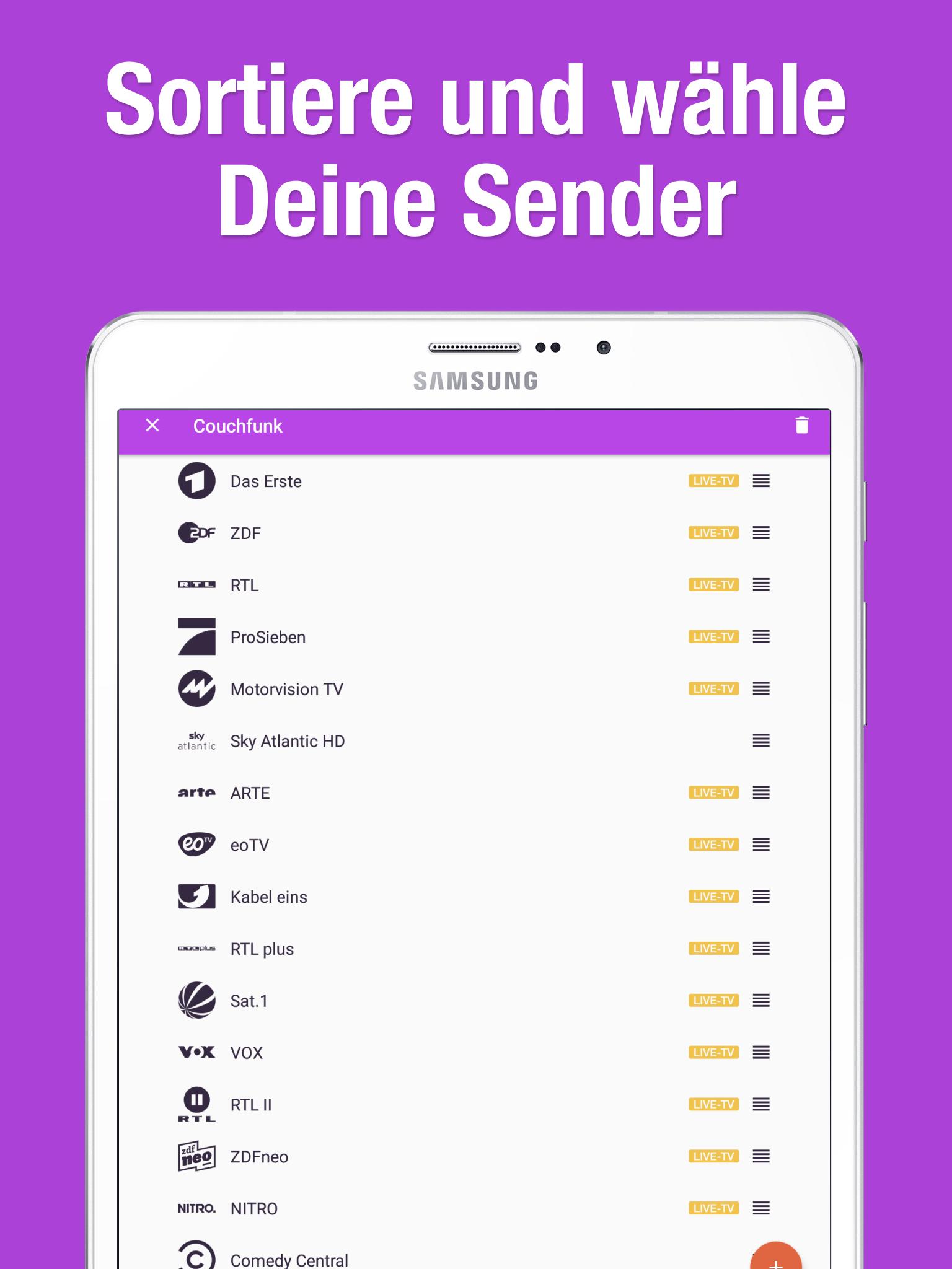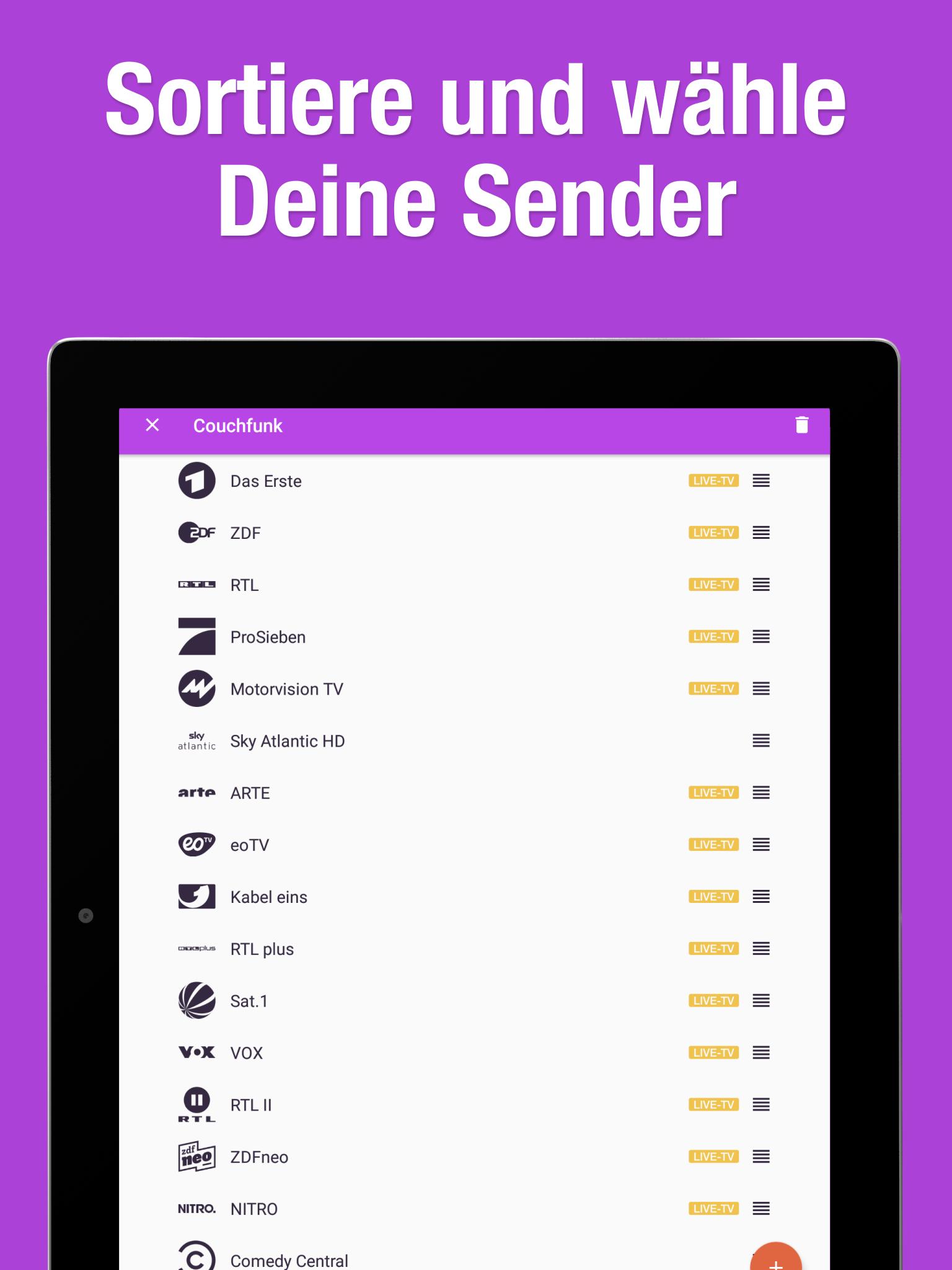 Die Couchfunk-App ist Teil der TV.de-App-Familie mit Apps für Live-TV, Fußball und Mediatheken. Einfach alle Apps kostenlos testen und Lieblings-Apps auswählen! Per Login können alle Einstellungen und Käufe übertragen werden.