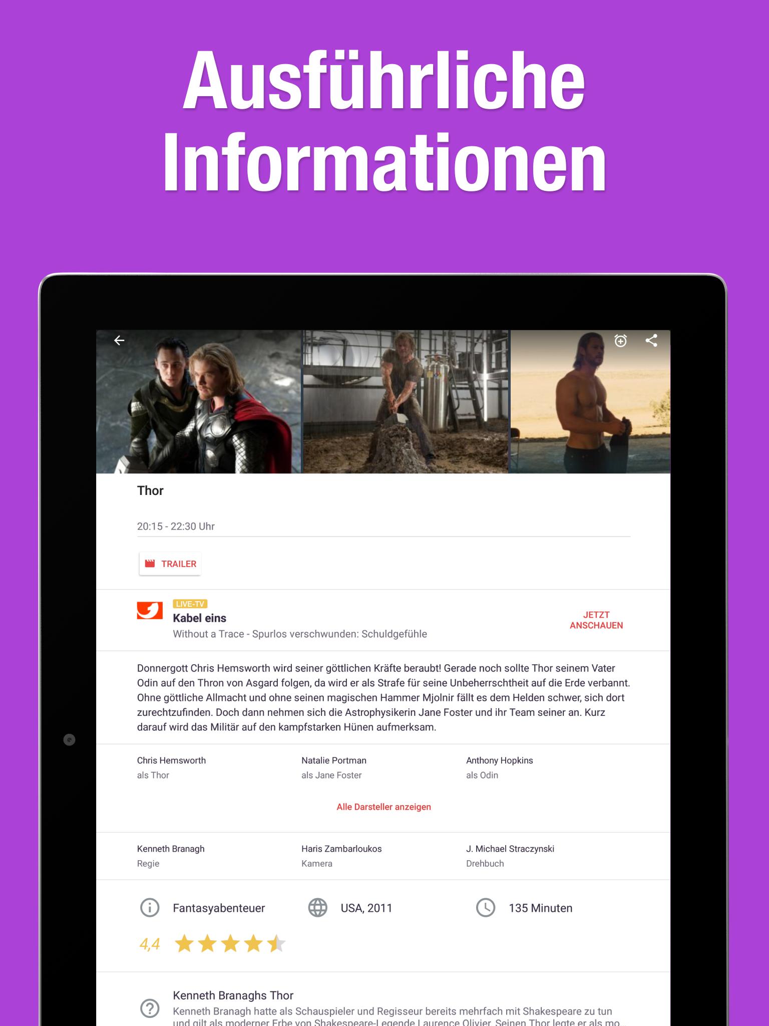 • Informationen zu Sendungen: Genre, Dauer, Darsteller, Erscheinungsjahr, Folgentitel, Episodennummer, Staffel…