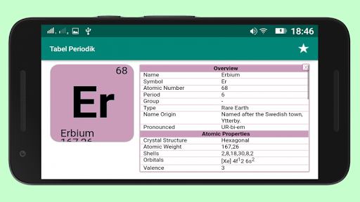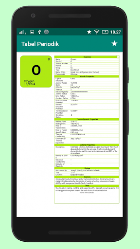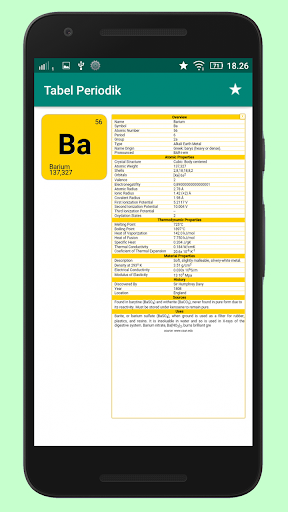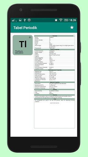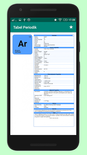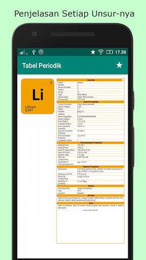 Aplikasi Tabel Periodik Unsur Kimia Terbaru Lengkap Beserta Penjelasan Setiap Unsur-nya. Berisi berbagai macam unsur kimia, Anda tinggal klik unsur dalam tabel untuk mengetahui penjelasan lebih detail mengenai unsur tersebut. Penjelasan meliputi nomor atom, nomor massa, tipe, nama asli, struktur kristal, berat atom, orbital, elektron valensi, jari-jari atom, letak golongan, periode, konfigurasi elektron, sifat unsur, dan banyak lagi.
