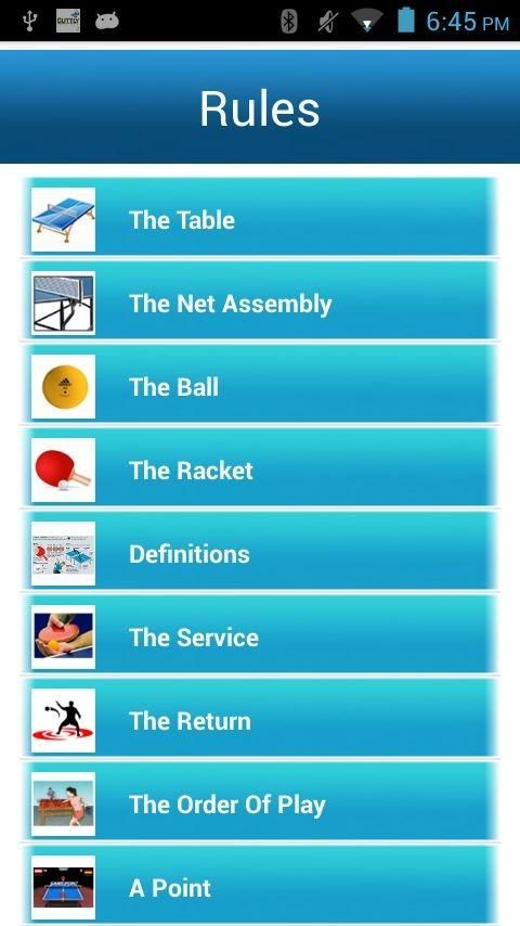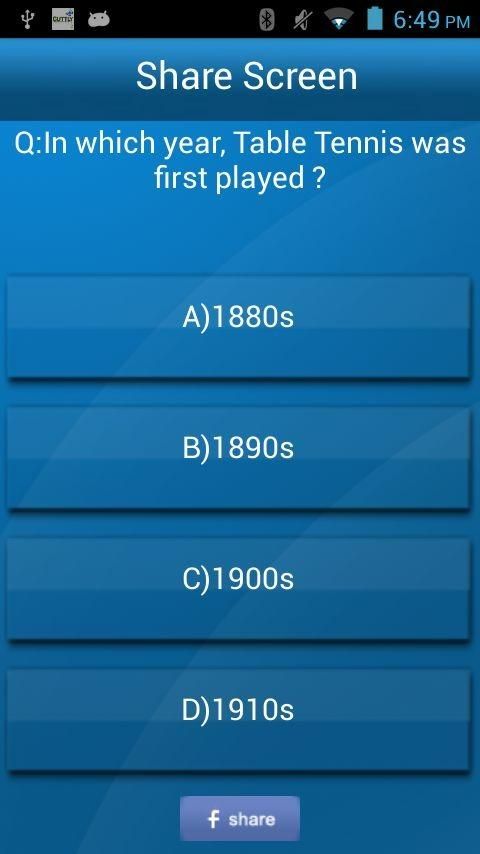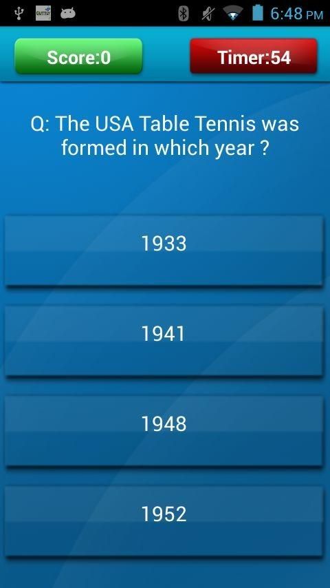 re you a Real Table Tennis Fan? We Challenge you! Table Tennis Quiz is an awesome application that challenges your knowledge of the top 50 table tennis questions. Have fun with the Men’s Table Tennis Quiz Game. Features: > In this app, there is a separate section to describe the rules applicable for playing tennis! > It has three levels, level one and two have 15 questions each and the third level has 20 questions, A player can only move to the next level once the previous level is complete. If the score is 10 then the player will get 1 star, in between 10-15 gets him 1.5 stars and for scoring 15 and above the player gets 3 stars. > Time Attack Mode - How far can you go in a 60 seconds quiz! > The questions are formed with different difficulty levels; the player gets 1 point each for a correct answer and a negative point for a answering it incorrectly. > Compete with your friends by sharing your score and upload the screen shot of the questions on Facebook