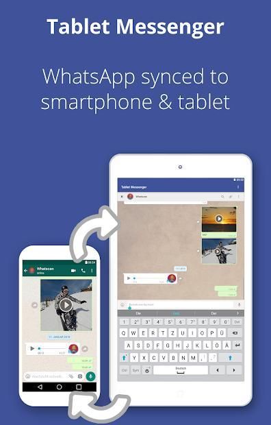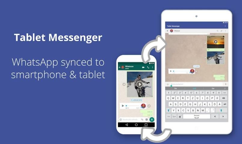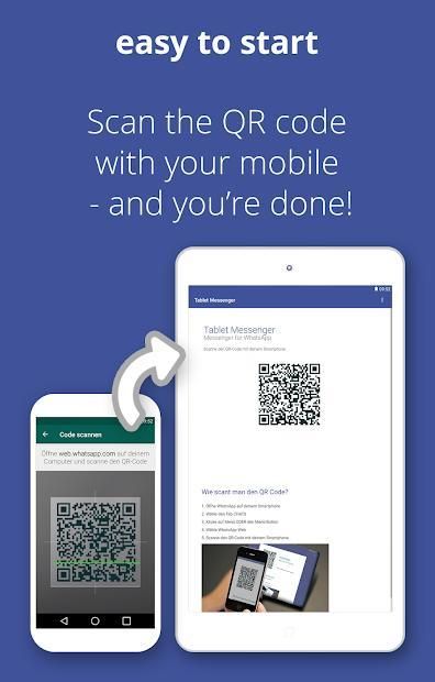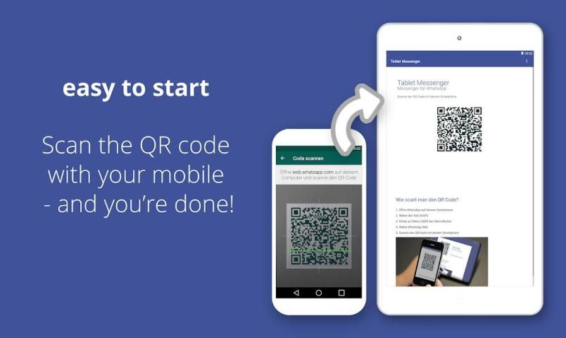 Tablet Messenger is the app that makes it easy to get WhatsApp from your smartphone to your tablet. Simply scan the QR code with your smartphone camera and chat comfortably on your tablet. Use your account on both devices at the same time. Connecting once is enough.