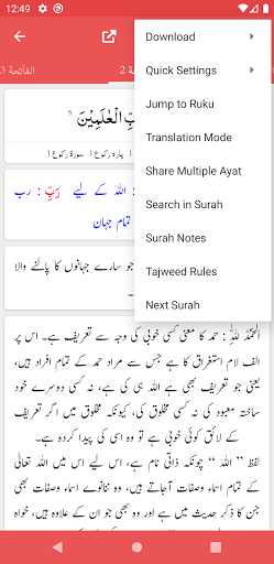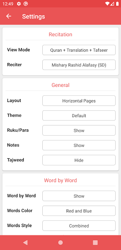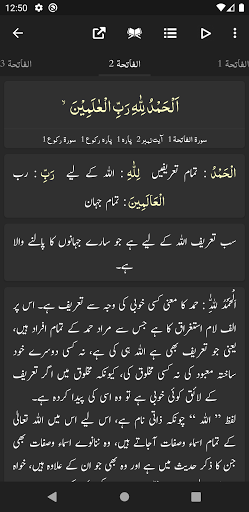 - Ability to show/hide Word by Word, Quran Translation (Tarjuma) and Tafseer
