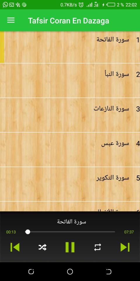 Tafsir Coran en Dazaga est une application Android mp3 qui vous permet d’écouter la traduction du Coran en langue Dazaga (Gouran) de Juz Amma, la tafsir est lit par le Sheikh Haroun Mahamat.