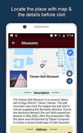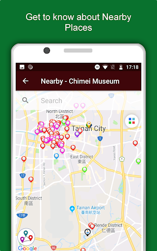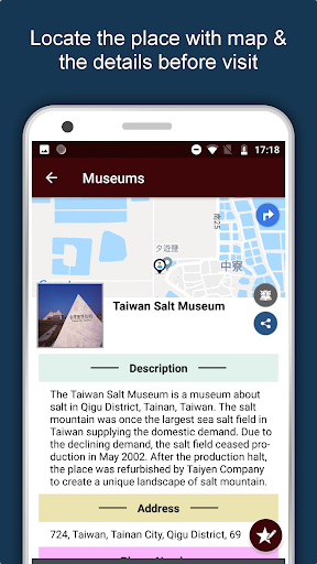 Apart from this, Tainan Travel & Explore guides you Why, When and How to visit various places in Tainan with precise location on the detailed Map. There are two ways to explore this app - Category view and EduBank favorite places view. Pin your destinations and get the routes on the Map. Not only this, you can see exactly how the places look like with Street View integrated in this app. The app also has a feature to Rate and write Review/Experience regarding entity(s) through Login. Your Travel experience and rating will help the user community.