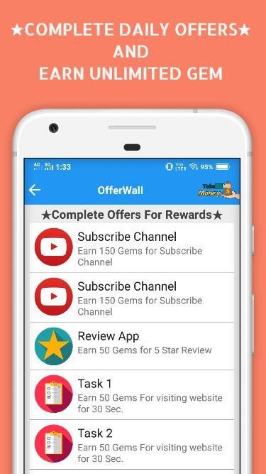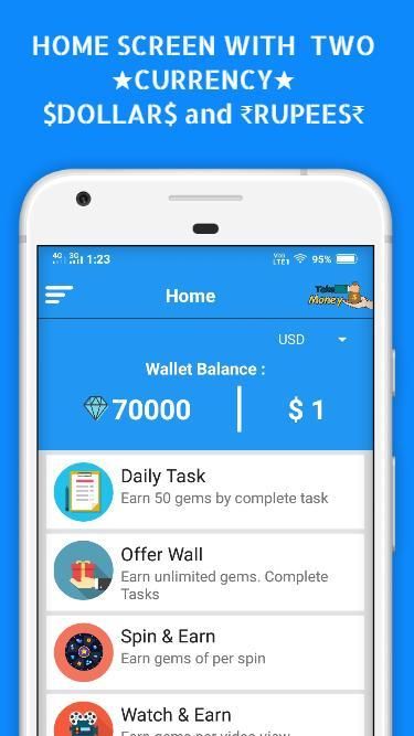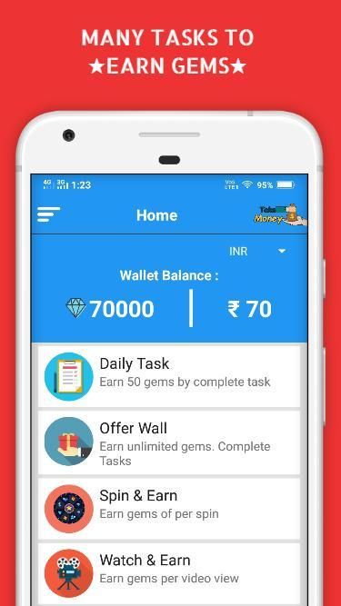 Earn real money by completing tasks inside the app. Easily earn free money by completing offers, Daliy Task and watching videos, with fast payments in Paypal and Paytm (free of fees).