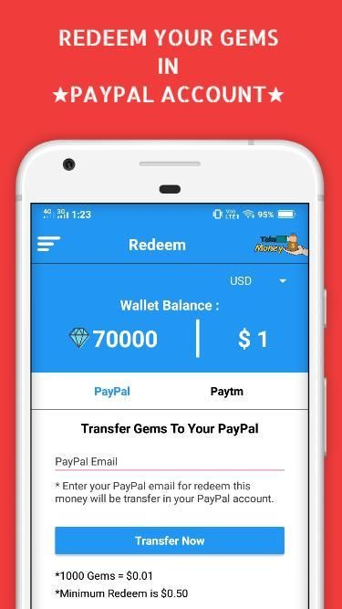 2. Redeem :) Once Your Gems balance complete minimum redeem you can request for redeem to be sent to your "PayPal" or "Paytm" account.