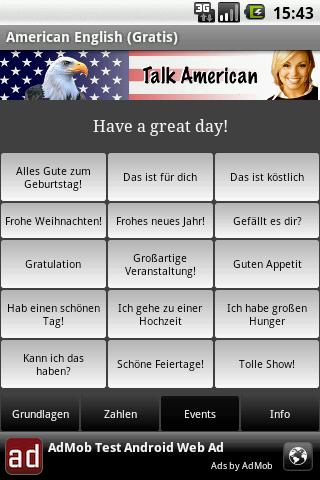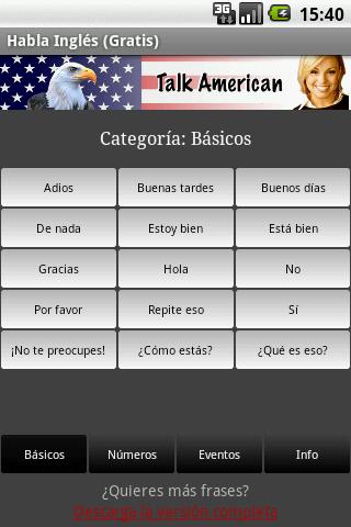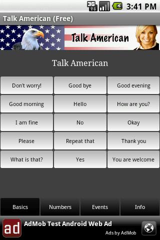 Learn how to communicate like a real American Quick, efficient and funEmphasize Hear, read and learn the most important American phrases Learn how to communicate like a real American Touch the phrase you think of and it will be spoken and shown in American english Quick, efficient and funFeatures: Clear audio recordings by a native American girl Very easy to use App2SD supported app can be moved to SD card No internetroaming required Works offline Organized in 3 categories compressed audio filestags: USA, United States, America, New York, San Francisco, los angeles Washington, Uncle Sam, Marines, Navy, Superman, Hollywood, Chicago, Detroit, uio, Atlanta, Austin, Texas, California, Miami, Florida, Southpark, Simpsons, Obama