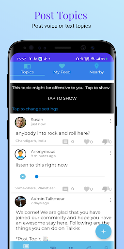 Post topics, share thoughts in comments. Dislike what you don't like. Post whatever on your mind anonymously. Or Talk about taboo topics in your private chat without revealing your identity. Do you like your voice? Post voice notes as topics.