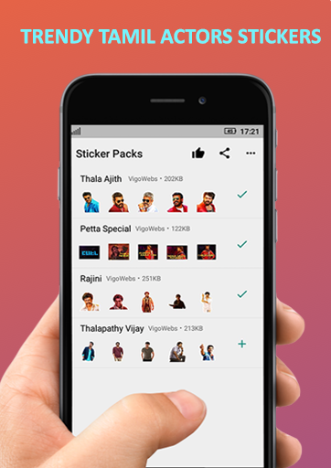 * Tamil Actors Stickers contains actors famous movie stills that you can use to chat.