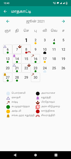 The monthly usage goes beyond simply showing the months and dates, we have included on our page all the details of government holidays, New Moon, Ekadasi, Shivaratri, Krithika, Shashti, Chaturthi, Pournami, Ashtami, Navami, auspicious days in a very simple way for everyone to easily understand. These are all offline.