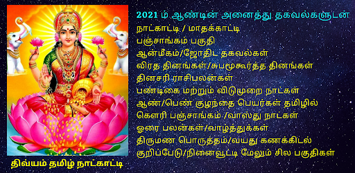 We are happy to release our free Divyam Tamil Calendar 2021 offline App. 'Tamil Calendar 2021' has been entirely updated with all the information like 2021 Calendar, Rasipalan, panchangam 2021, Holidays, Festivals,suba horaigal, wishes, Subha Muhurtham, etc. Users can view the complete details of the Daily Calendar as well as the Monthly Calendar in Tamil.