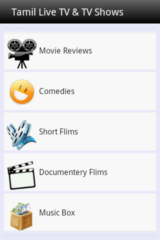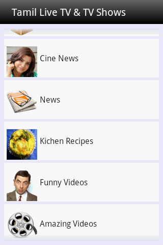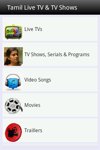 Tamil - live tv and All in One is the one of the free app for all entertainment need. This app has like Live TV channels, tv shows Serials & Programs, Video Songs, Movies, Trailers, Movie Reviews, Comedies by All actor,Short Flims, Documentary Flims, Music Box, Cine News, News, Teasers, Kitchen Recipes, Funny Videos, Amazing Videos, Kids Junction and even More.. Programs and Shows like special events, festival and celebrationsHave better seamless experience with 3G/4G or WiFi networks.List of Tamil Videos----------------------:: Live TV ::| Sun TV | Sun Life | Jaya TV | Jaya Plus | Vijay TV | Raj TV | Raj plus | Mega TV | Mega 24 | Captan TV | Polimer TV | Makkal TV | Vasanth TV | Tamilan TV | Win TV | Zee Tamil | Podhigai TV | Moon TV | Minnal TV | Peppers TV | Vasantham TV | Dan Yarl Oli TV | Sun News | Kalaigar News | Puthiya Thalaimurai TV | Raj News | Thandhi TV | GTV News | Jaya News | Captan News | Lotus News | Sathyam TV | NDTV 24x7 | Sun Music | Jaya Max | Isai Aruvi | Raj Music | Mega Music | Murasu | Minnal Music | 7s Music | Minnal Hits | K TV | Sun Action | Jaya Movies | Tamil Cinema Club | HBO | Chutti TV | Chithiram TV | Minnal Kids | Pogo | Cartoon Networks | Tom & Jerry | Disney |:: Movies ::| New tamil Movies | Tamil mid movies | Old Movies | Hot Tamil Movies | Tamil Dubbed Movies | Hollwood Movies | Regional Movies | Movie Trailers | Movie Review |:: Comedy Videos ::| Goundamani Senthil Comed | Vadivel Comedy | Vivek Comedy | Santhanam Comedy | Kanja Karuppu Comedy | Nagesh Comedy | Chandrababu Comedy |:: Video Songs ::| New Video songs | Tamil Mid Songs | Old Songs | Hot Video Songs |:: Cinema News ::| Latest News | Actor News | Actress News | Stars Interview | audio Launch | Events |:: Kitchen Recipes ::| Non- Veg Recipes | Veg Recipes | Tips |:: Kids ::| Rhmes | Story | Cartoons |Don't forget to provide your valuable feedbacks, comments and ratings :-)DISCLIAMER:All video's listed in this application is hosted by YouTube. All these videos are publicly available on YouTube and uploaded by other YouTube users hence we are not having access to remove the video. We don't manage or upload any video. It's just an organised platform to browse and watch the YouTube videos