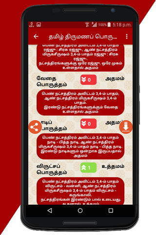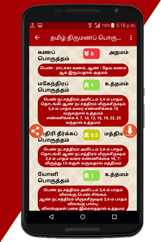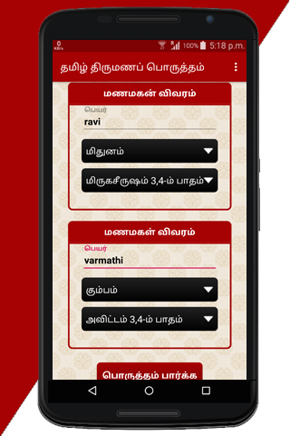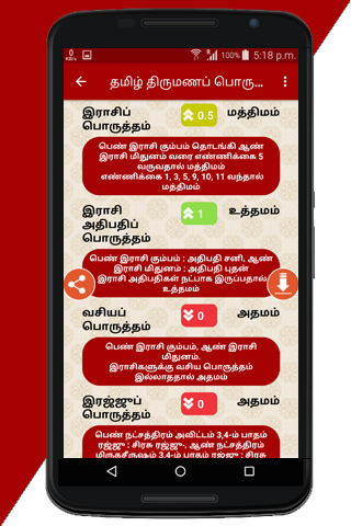 This app report compatibility of marriage matching factors such as Thinam Porutham, Ganam Porutham, Mahendram Porutham, Sthree theerkam Porutham, Yoni Porutham, Rasi Porutham, Rasi athipathi Porutham, Vasiyam Porutham,Rajju Porutham ,Vethai Porutham, Nadi porutham and Virutcha porutham.