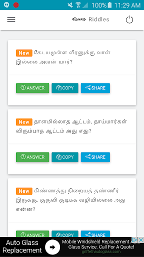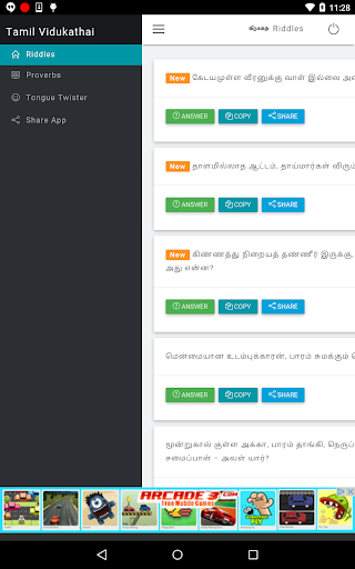 Tamil Riddles playing is a part of language development and also helps analytical thinking and creativity. Our tamil vidukathai app is one of the best app to improve tamil language for kids. In this app you can increase your creative thinking skills. Once user reads it and wanted to verify answer, he needs to touch ans button. Then it will display the answer. It is a Tamil fun game. It is more enjoyable to play with your friends and parents. tamil vidukathai with answer app is useful for all kinds of persons form kids to parents.