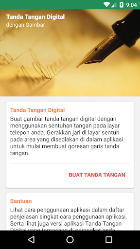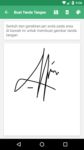 Aplikasi ini adalah aplikasi sederhana untuk membuat gambar tanda tangan dengan sentuhan pada layar perangkat atau telepon. Pengguna cukup melakukan sentuhan geser pada halaman yang disediakan untuk membuat garis tanda tangan. Kemudian pengguna dapat menyimpan tanda tangan tersebut dengan nama yang telah ditentukan pengguna. Nama gambar akan disimpan juga didalam meta-data gambar dalam bentuk data Exif gambar.