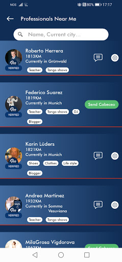 TangoPartner.com is here to help you find nearby Tango friends wherever you go. Just swipe through thousands of like-minded tango lovers in your area and give a Cabeceo (Invitation to dance) for the ones you like. Share a glass of wine and dance a beautiful Tanda at the local Milonga. You can also find partners for Salsa, Cumbia, Swing and other dances.