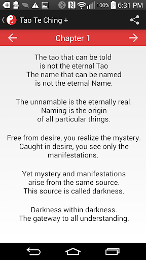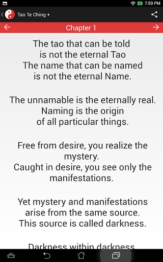The Tao Te Ching is widely recognized as one of the East's great philosophical texts. Written in the fifth century BC, this classic by Lao Tzu has provoked intrigue, thought and conflict in the 2500 years subsequent to its existence. Now, this timeless text is brought to your fingertips with this beautiful digital rendition. Scroll through all 81 verses at your leisure, on the go on your smartphone, or at home on your tablet. Additional features include the ability to share your newfound wisdom with your friends, and a random verse selector to satiate your serendipitous streak.