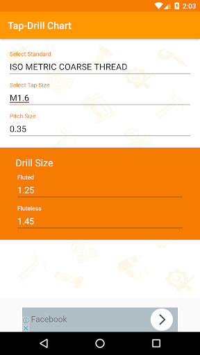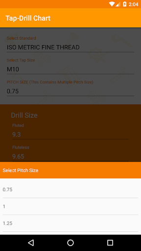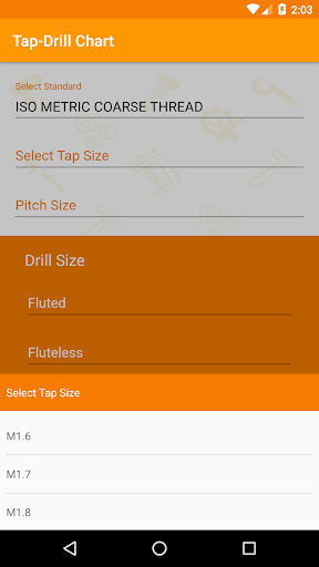 This app is a simple drill & tap reference guide. The interface is designed to be quick so that you can get back to your project without messing with your phone or tablet too much.
