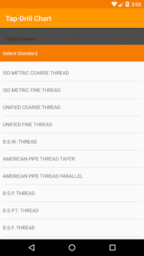 This app gives drill and tap tables for all common thread sizes including: ISO METRIC COARSE THREAD, ISO METRIC FINE THREAD, UNIFIED COARSE THREAD, UNIFIED FINE THREAD, B.S.W. THREAD, AMERICAN PIPE THREAD TAPER, AMERICAN PIPE THREAD PARALLEL, B.S.P. THREAD, B.S.P.T. THREAD, B.S.F. THREAD.