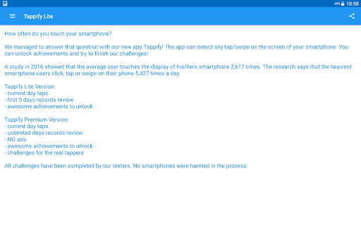 We managed to answer that question with our new app Tappify! The app can detect any tap/swipe on the screen of your smartphone. You can unlock achievements and try to finish our challenges!