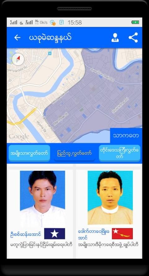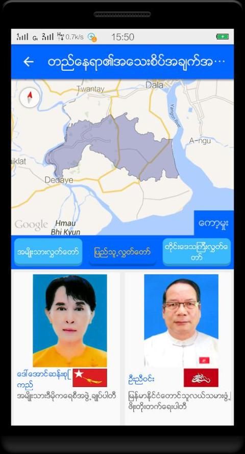 မိမိဖုန္း၏လက္ရွိတည္ေနရာ အတြင္းတြင္ရွိေသာ လႊတ္ေတာ္ကိုယ္စားလွယ္ေလာင္းမ်ား၏ စာရင္းကိုလည္း 'ယခုမဲဆႏၵနယ္' မွတဆင္႔ၾကည္႕ရွဳနိင္သည္။