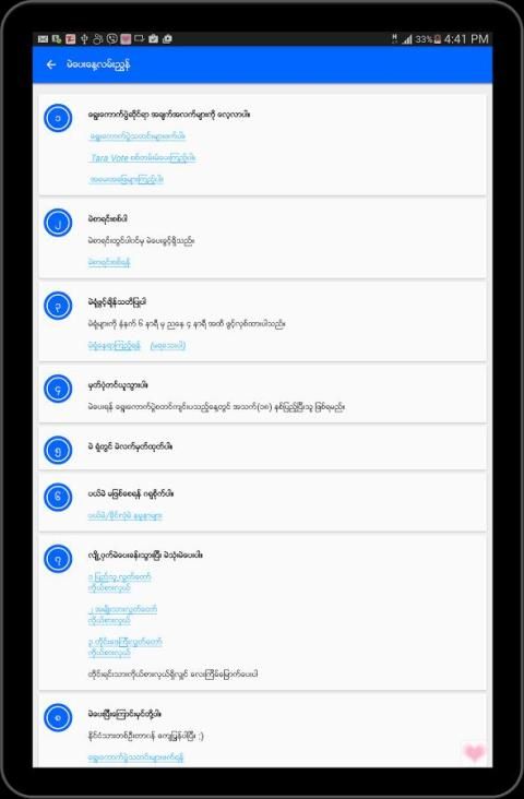 ထို့အပြင် မဲပေးနေ့လမ်းညွန်ကိုလည်း အဆင့်ဆင့်ဖြင့်ရှင်းလင်းထည့်သွင်းထားသည်။