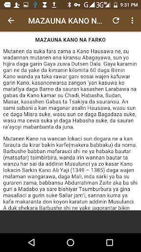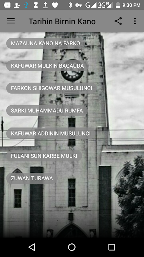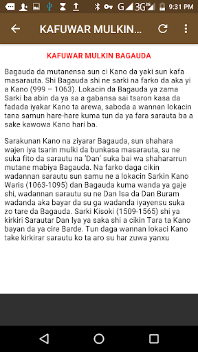 Wannan Application ya kunshi Tarihin asalin birnin kano, mazauna birnin nafarko, sarakunansu, addininsu na gargajiya,kafuwar addinin sululci da zuwan turawa.