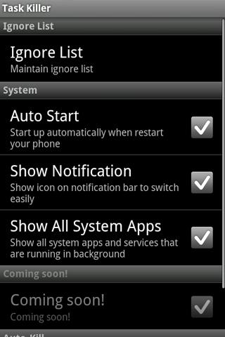 Task KillerInstall Task Killer,when you want to stop multinomial Software of background program,maybe in the actual situation of Android moving operating system,you need to manage you acpplication to avoid the damage of performance and battery.Task Killer is my favorite applicition,it also including a plugin,tap it once,you can close all the started applications.What you can do from the setting:Ignore List:you can put the app what you don39;t want to stop into this list,so that when you use Task Killer to stop all task,the app which in the Ignore List will be ignored.Auto Start:when you choose it,Task Killer will be Auto Started when you starting up.And it will make some unconcerned task to stop.Also you can make a shortcut to desktop.AutoKill:It39;s a greatful and useful setting.You can choose to make Task Killer still work and stop the Software of background program when you phone is off.Thanks for your loves of Task Killer.